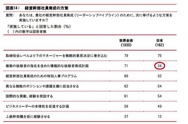 さらに、人材戦略を重視する傾向は世界全体と同レベルに高いものの(80%)、後継者育成計画を実施すると回答した日本のCEOは34%と、世界全体の71%の半分以下という低い水準にとどまっている。