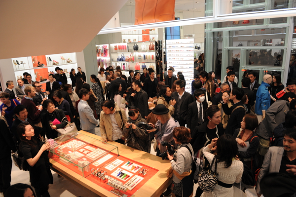 オープン前に開催されたプレス内覧会。多くのメディアや著名人が訪れ、店舗オープンを盛り上げた。店舗オープンを記念し、表参道店限定で桜をモチーフにしたハンドホルダーや風船を配布。内覧会では南青山のフレンチレストラン「NARISAWA」のフィンガーフードが配られた。