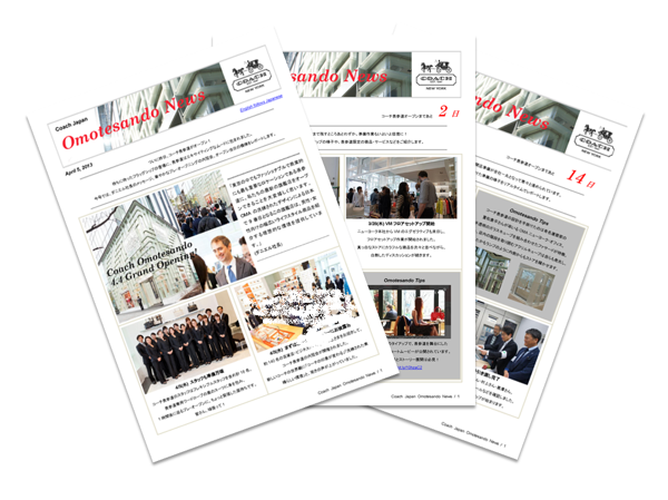 インナーコミュニケーションにも力を入れているコーチ・ジャパン。企業広報担当が中心となり、毎月1回、東京本社勤務の社員や全国の店舗スタッフを対象に社内向けニュースレターを発行している。写真は表参道店オープンに向け、“特別版”として合計5回に渡って発行された「Omotesando News」。新旗艦店オープンに向けた動きを、ブランドに携わる社員全員に知ってもらえるよう、5回シリーズで発行した。「ブランド力を高めるためには、ブランドの“今”の動きを全スタッフが共通して知ることが必要。新店舗オープンも、一部のスタッフだけに関わる動きでなく全国のスタッフに知ってほしいと制作しました」(石田氏)。また、日本独自のユニークな「資格制度」も2010年から導入。レザーや修理に関する知識を備えた“スペシャリスト”になるための試験制度など、ブランド活性に向けた取り組みを積極的に行う。