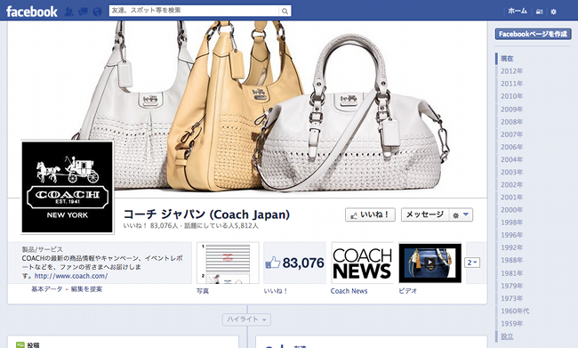 現在約7万8000人のファン数を持つ、コーチ・ジャパンの公式フェイスブックページ。新店舗オープン時には、10日前からページ上でカウントダウンを行い、キャンペーンなどを展開した。運営はウェブチームが行う。