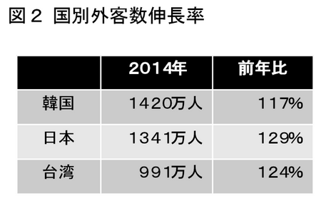 図2のように、韓国や台湾など近隣諸国にも外国人観光客は押し寄せています。中国人観光客は日本だけでなくアジアや欧米など世界各国へと海外旅行に出向いているのです。客単価の伸長率118%には、円安効果(前年対比116%程度と推計)が含まれていることを忘れてはいいけません。これを差し引くと、全体としての客単価はほぼ前年並みにとどまっていることになります。