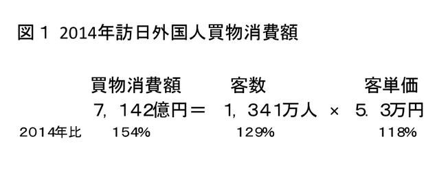 2014年、訪日客によるショッピング消費額を客数と客単価に分解すると、図1の通りになります。訪日客数の伸長率129%に対して、買物消費額は154%伸びており、驚異的だと言えるかもしれません。しかし、それぞれの要素について、冷静に考えてみましょう。