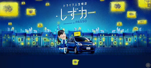 「PASSO」の主要ターゲットである20~30歳代女性の使用頻度が高いメッセージアプリ「LINE」を活用する。1200万人が「友だち」登録している「TOYOTOWN」公式アカウントに相談したい悩みを送った人の中から毎日6人ほどを選ぶ。期間中の夕方5時~夜11時に「パッソ」を配車。選ばれた参加者はおよそ15分間、ドライブをしながら同乗する著名人に話を聞いてもらえる。相談を受ける著名人は日替わりで、イラストレーターのみうらじゅんさんや、元衆議院議員の杉村太蔵さんら9人。