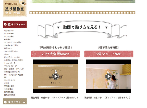 」では、壁紙の貼り方を解説した各種コンテンツがアップされています。お客さんは、「えっ?壁紙って自分で貼れるの?」という人から「実際に壁紙が届いたので詳しく細部まで見たい」という人まで様々です。そこで細部まで分かる動画をつくったところ、20分になりました。それだと長いという人のために、5分のショートバージョンをつくり、さらに「自分でも貼れるの?」と興味を持ってくれたばかりの人に見てもらいやすいように、40秒のダイジェスト版を用意しました。これは「早回し」風のつくりになっているものです。まずは短いものを見てもらい、それで興味が高まったら長いバージョンを見てもらうという「接客設計図」の視点は参考になります。