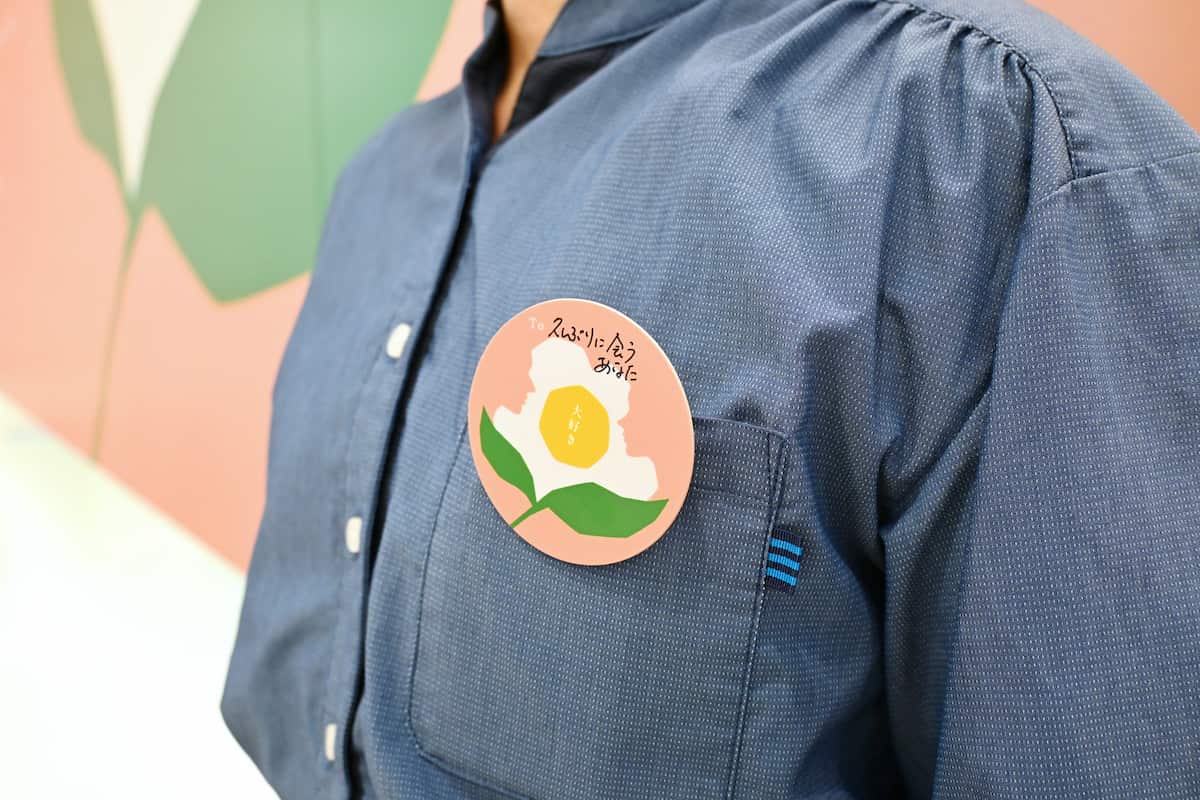 さらに店員向けには、手提げと同じ花のデザインのバッジも制作。手提げ同様に、中央の部分に好きなメッセージのシールを選んで貼れるようになっている。各店では「言葉を贈る手提げ」のデザインをきっかけに、来店客との会話も生まれている。