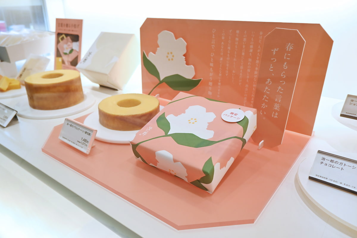 大きいサイズの手提げは17 万枚、小さい方は約8 万枚を用意し、「治一郎」の全国28 店舗で使用。旗艦商品の「治一郎のバウムクーヘン」のみ、包装紙でも本デザインを採用した。