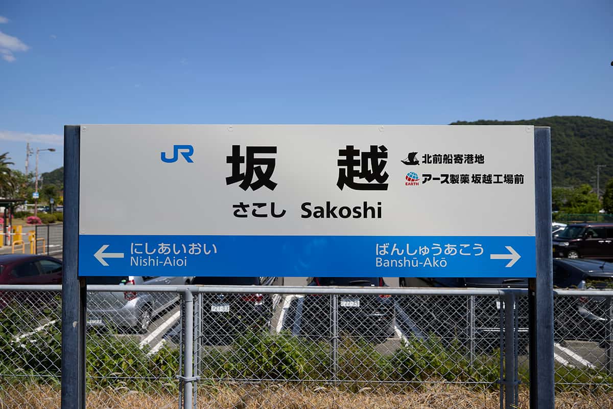 「北前船寄港地 アース製薬坂越工場前」の文言を追加されたJR坂越駅の駅名標