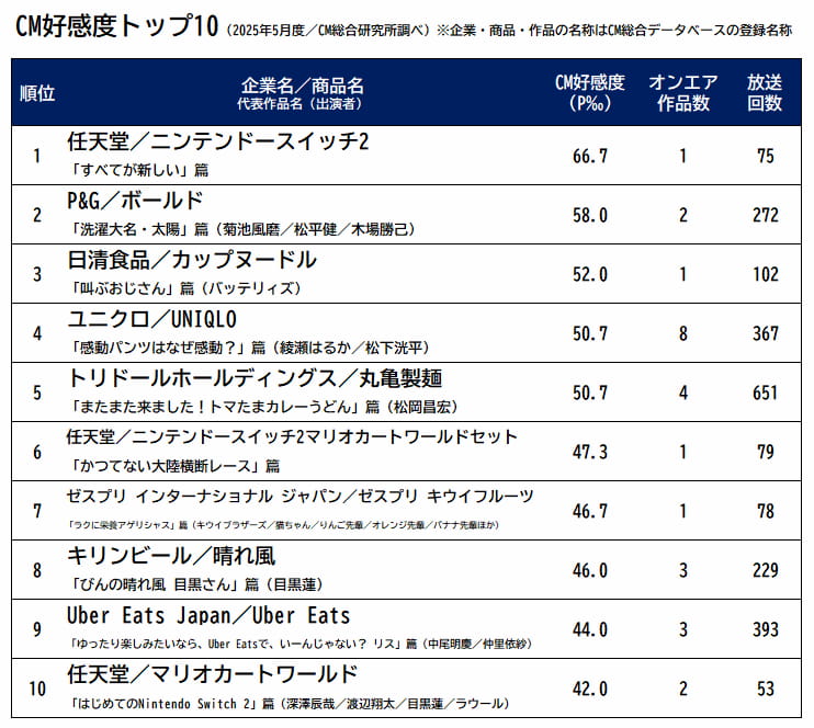 調査期間は2025年4月20日から5月19日まで、東京キー5局で放映されたCMが対象(全オンエア数:2330銘柄)。関東1都6県3000人に聞いた。