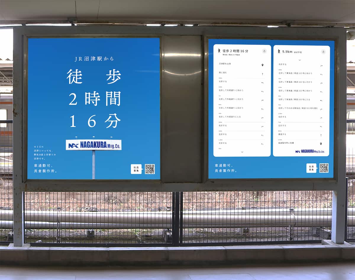 CM放映と同日には、JR沼津駅 在来線改札内にOOH広告を掲出。「徒歩2時間16分」という極端な通勤ルートとともに、その詳細な道順を丁寧に紹介する内容で、「車通勤可」であることを逆説的に伝えている。