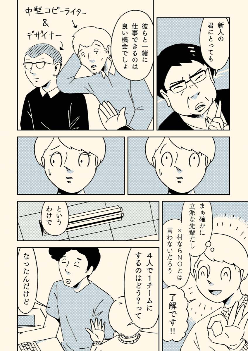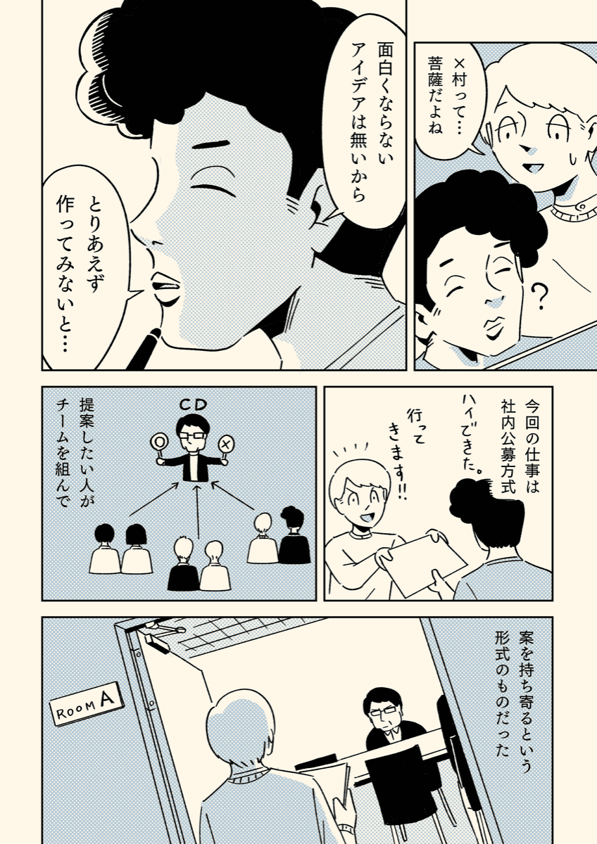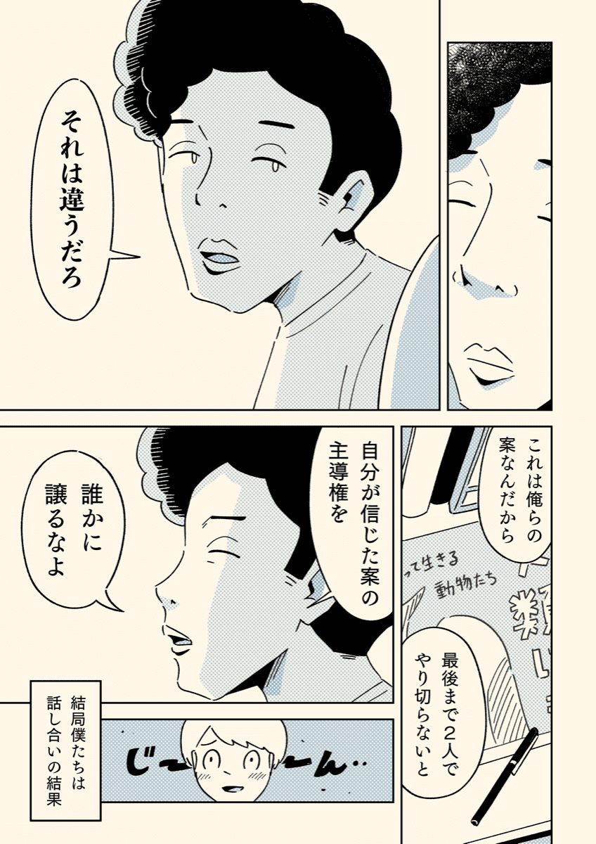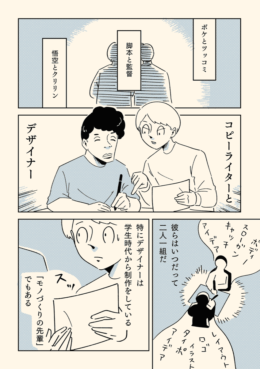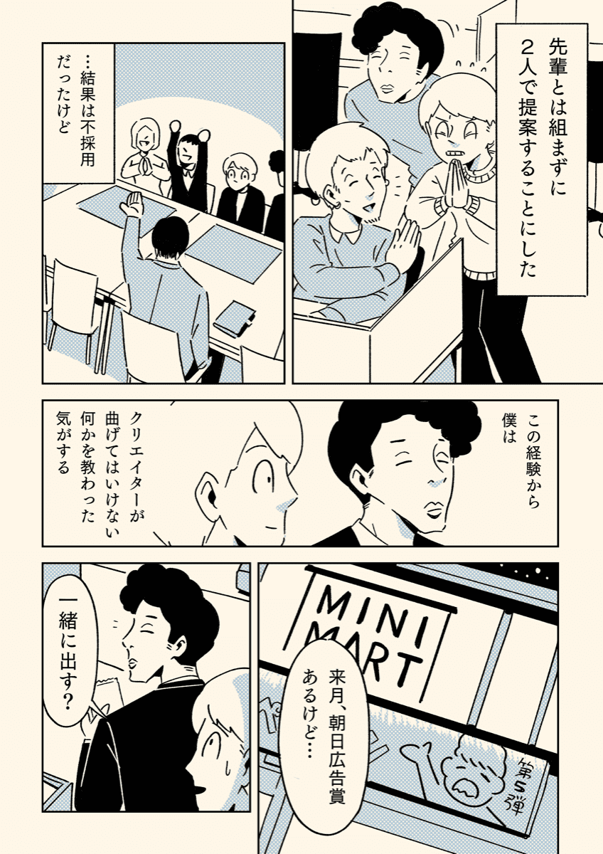 コラム 新人コピーライターの奮闘記 マンガ『ゾワワの神様』 ゾワワの神様 第37話「譲ってはいけないもの」 うえはらけいた(漫画家) 公開日2025.7.11 印刷 / PDF URLをコピー URLをコピーしました! 次回 ゾワワの神様 第38話「アイデアはマグレで生まれない」 はこちら うえはらけいた(漫画家) うえはらけいた(漫画家) 1988年、東京都生まれ。2016年に株式会社博報堂から多摩美術大学に編入し、マンガを描き始める。卒業後は広告会社などでデザイナーをしながら活動していたが、2020年4月にマンガ家として独立。主な著作に「ゾワワの神様」(祥伝社)、「コロナが明けたらしたいこと」(アスコム)、「アバウトアヒーロー」など。X:@ueharakeita うえはらけいた(漫画家) 1988年、東京都生まれ。2016年に株式会社博報堂から多摩美術大学に編入し、マンガを描き始める。卒業後は広告会社などでデザイナーをしながら活動していたが、2020年4月にマンガ家として独立。主な著作に「ゾワワの神様」(祥伝社)、「コロナが明けたらしたいこと」(アスコム)、「アバウトアヒーロー」など。X:@ueharakeita この記事の感想を教えて下さい。 この記事の感想を教えて下さい。 0 発見があった 0 特に見るべきものがなかった 0 もっと知りたい