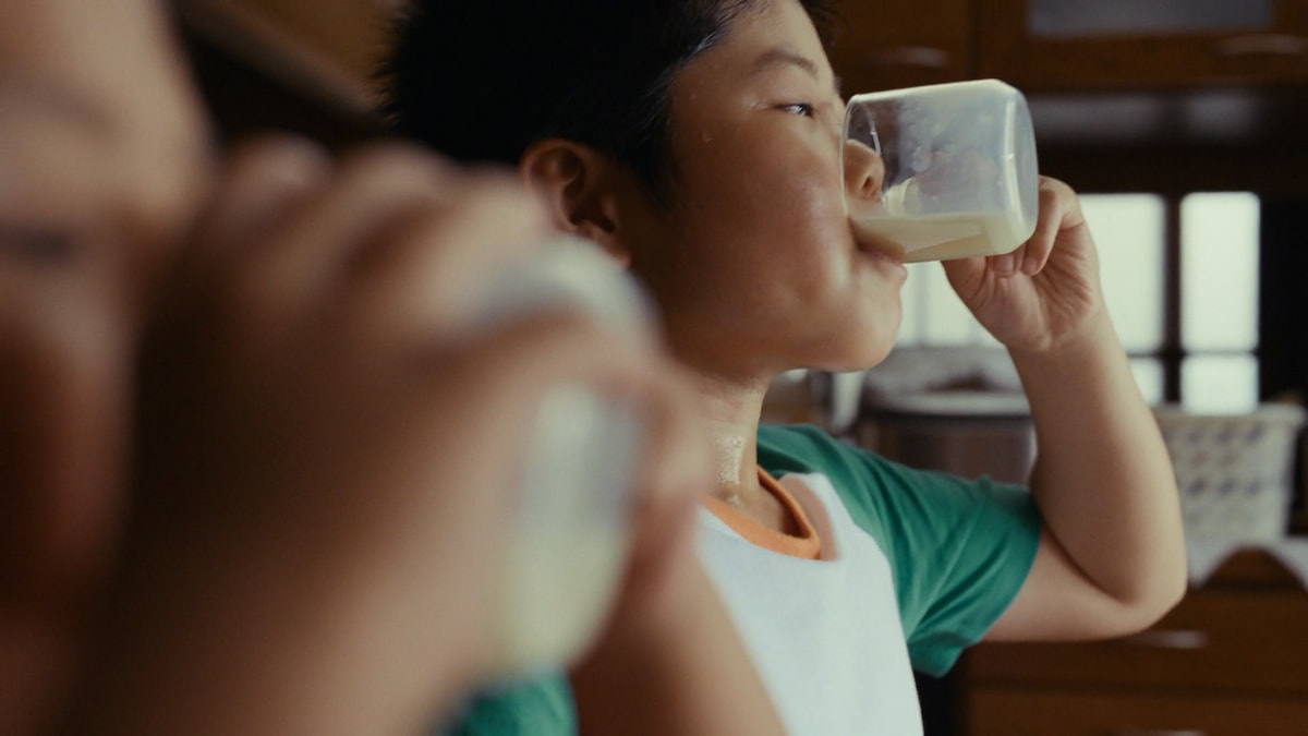 お腹を満たした2人は再び怪獣の姿となり、虫かごを持って元気に外へ。成長期の子どもたちの栄養バランスを思いやるCMとなっている。