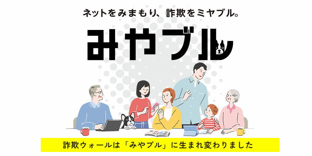 「みやブル」はネット詐欺対策に特化したセキュリティソフト。フィッシング詐欺、ワンクリック詐欺、偽通販サイトなど各種詐欺サイトへのアクセスを自動でブロックする。PC・スマートフォン・タブレットなど複数デバイスに対応している。「ブラックリスト検知」「ヒューリスティック検知」「AI検知」の3つの検知方法からなる独自の検知エンジンを搭載している。大手キャリア回線事業者や家電量販店など約30社以上の事業者のネット詐欺対策サービスとして活用されている。