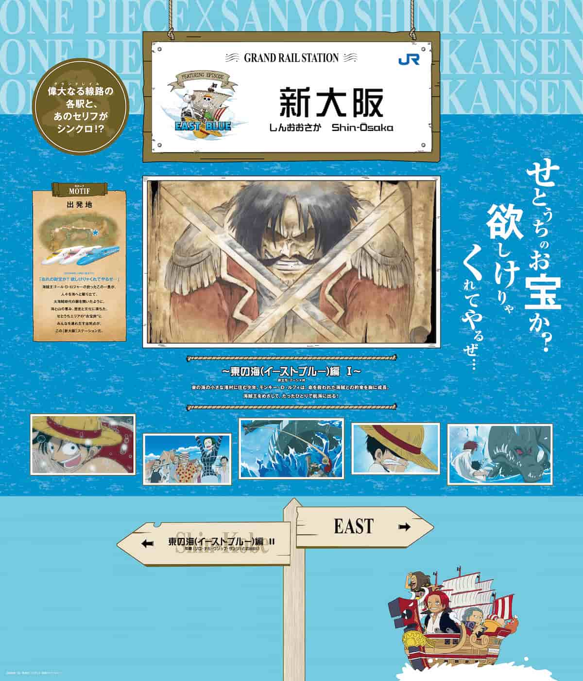 「ONE PIECE新幹線 夏の大冒険!!キャンペーン」の一環として今回、設置される「ONE PIECE新幹線スペシャルゾーン」は、全19駅共通のウェルカムアートに加えて、駅周辺のおすすめ観光地を『ONE PIECE』の仲間たちが紹介する観光マップが掲出される。また、山陽新幹線各駅を、「東の海(イーストブルー)」篇から「エッグヘッド」篇までの『ONE PIECE』各篇の舞台になぞらえ、1シーンと名セリフで表現したコラボビジュアルも展示される。
