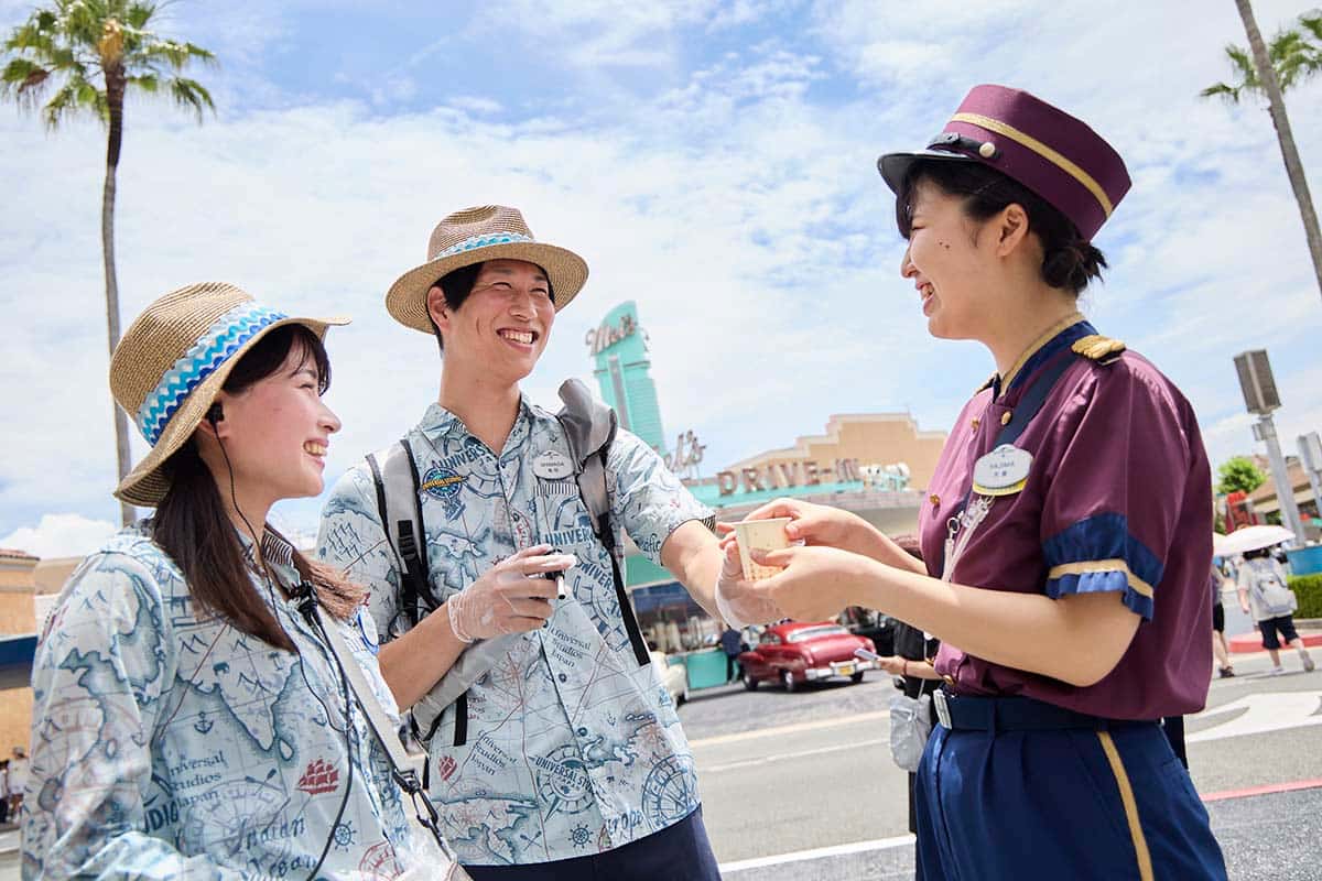 炎天下で働くクルーの熱中症対策として、冷たいドリンクやおしぼり、塩分タブレットなどを提供する特別チーム、通称「オアシス隊」(左2人)。彼らはパーク内を巡回し、クルーに積極的に声を掛け、水分補給を促す。2025年は例年より稼働を約1週間早めた。