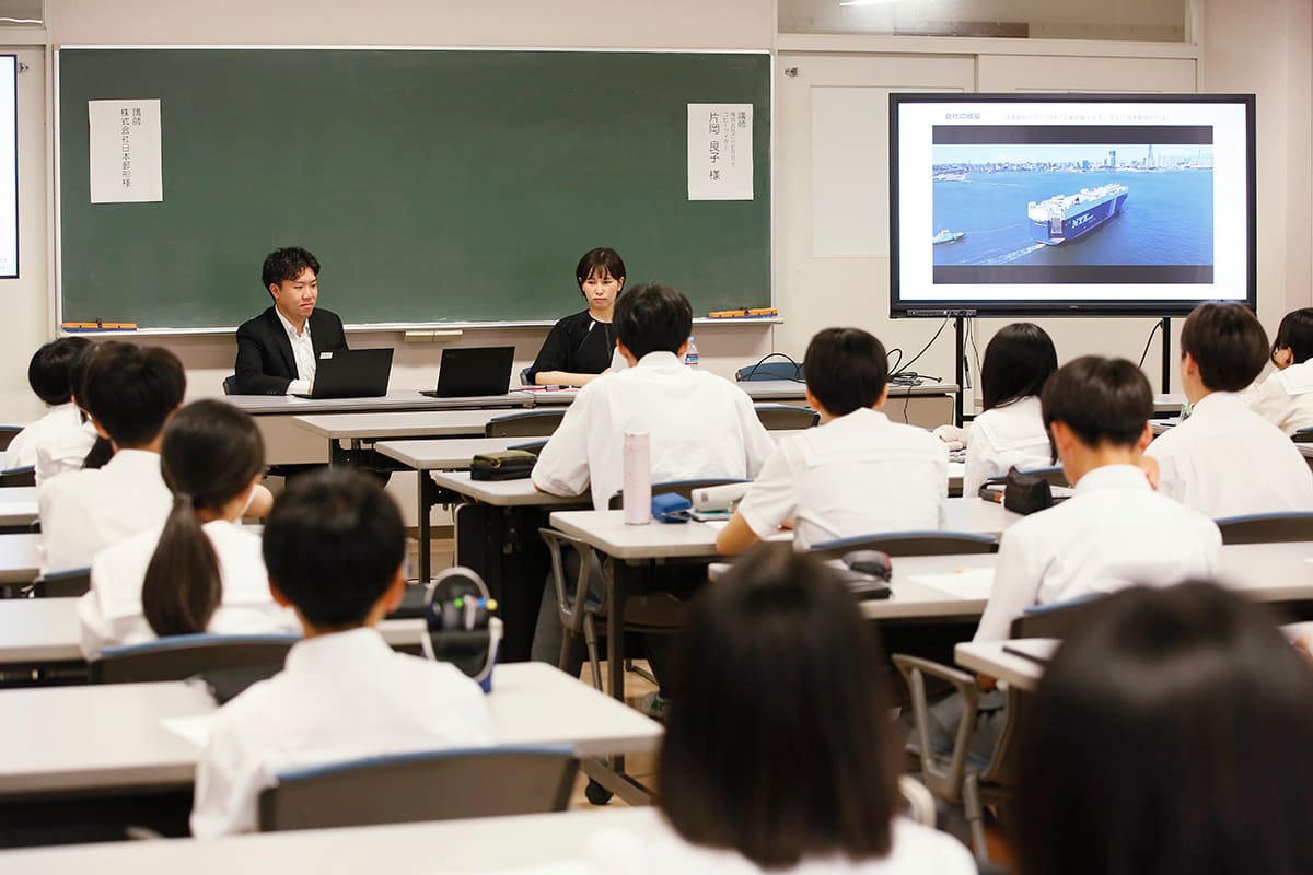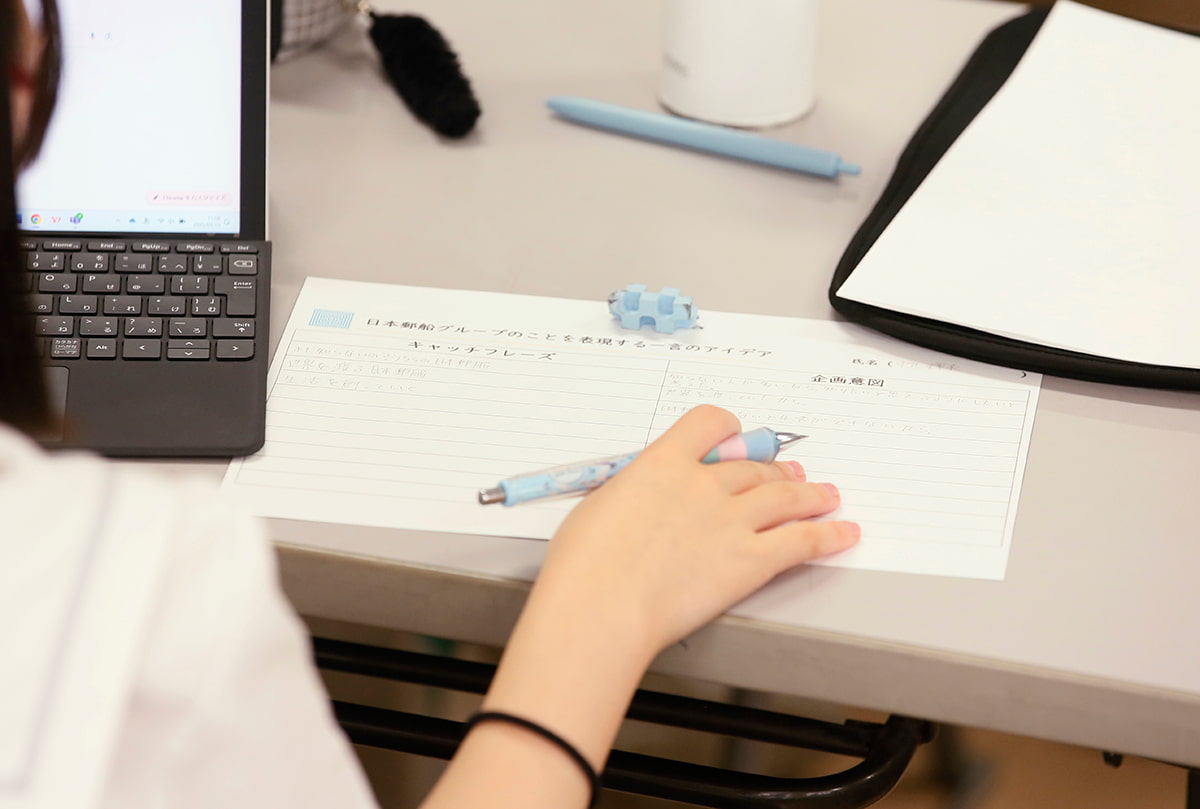 生徒たちが挑戦したテーマは「日本郵船グループのことを表現する一言のアイデア」です。日本郵船グループが運航する船の数はなんと886隻。資源や物資を運んで日常生活を支えるという地球規模の仕事を、どうやってひと言で表現したらいいのでしょうか?日本郵船広報グループの髙倉康輔さんの解説や、片岡さんのヒントを元にコピーを考えました。