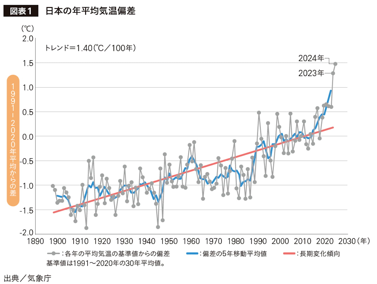 【図表1】は気象庁が作成した、日本の年平均気温偏差の推移です。平年値は、30年間の平均気温から算出しており、このグラフでは1991 ~ 2020年のデータに基づく平年値を基準にしたプラスマイナスで示されています。