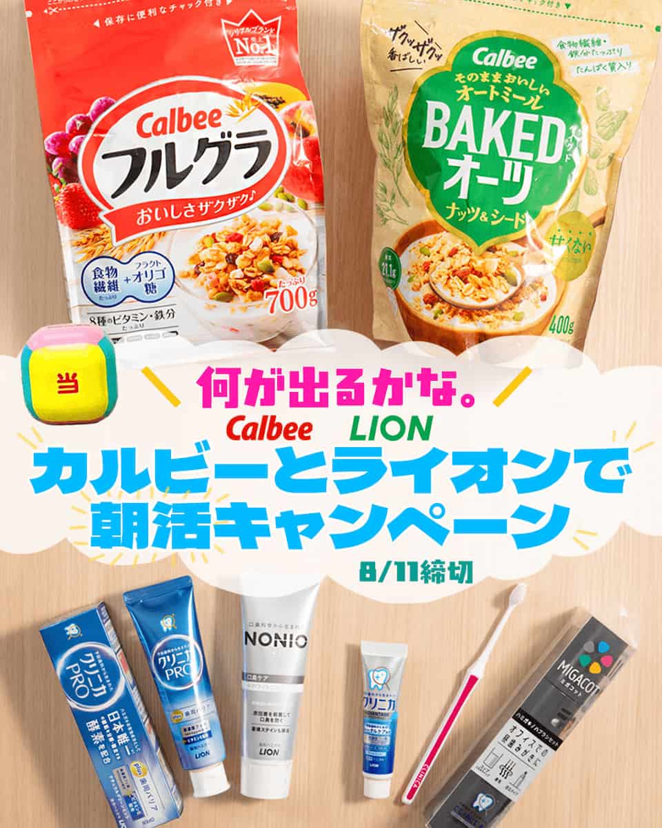 また、「カルビーとライオンで朝活」キャンペーンはカルビー公式Instagram上で実施。カルビーのアカウントをフォローの上、キャンペーン投稿に「#カルビーとライオンで朝活」をつけてコメントすることで応募。応募者のなかから抽選でカルビーの「フルグラ」をはじめとするシリアルや、ライオンの歯ブラシや歯磨き粉といった商品を組み合わせた「カルビーとライオンで朝活セット」が当選する。