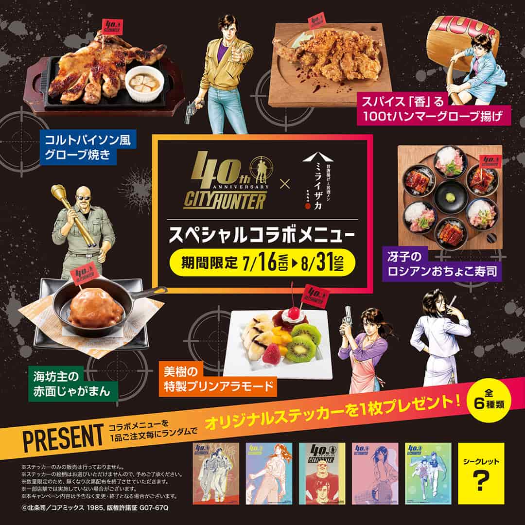 ワタミグループは8月1日、居酒屋「ミライザカ」など同社運営の外食4チェーンで開催中の「シティーハンター40周年×ワタミコラボフェア」で提供している限定メニューの売上が累計1万食を突破したと発表した。漫画『シティーハンター』の連載40周年を記念した企画で、特に 1980年代からの往年ファンの来店が目立ち、SNS上ではコラボメニューやステッカーの写真投稿が多数見られている。