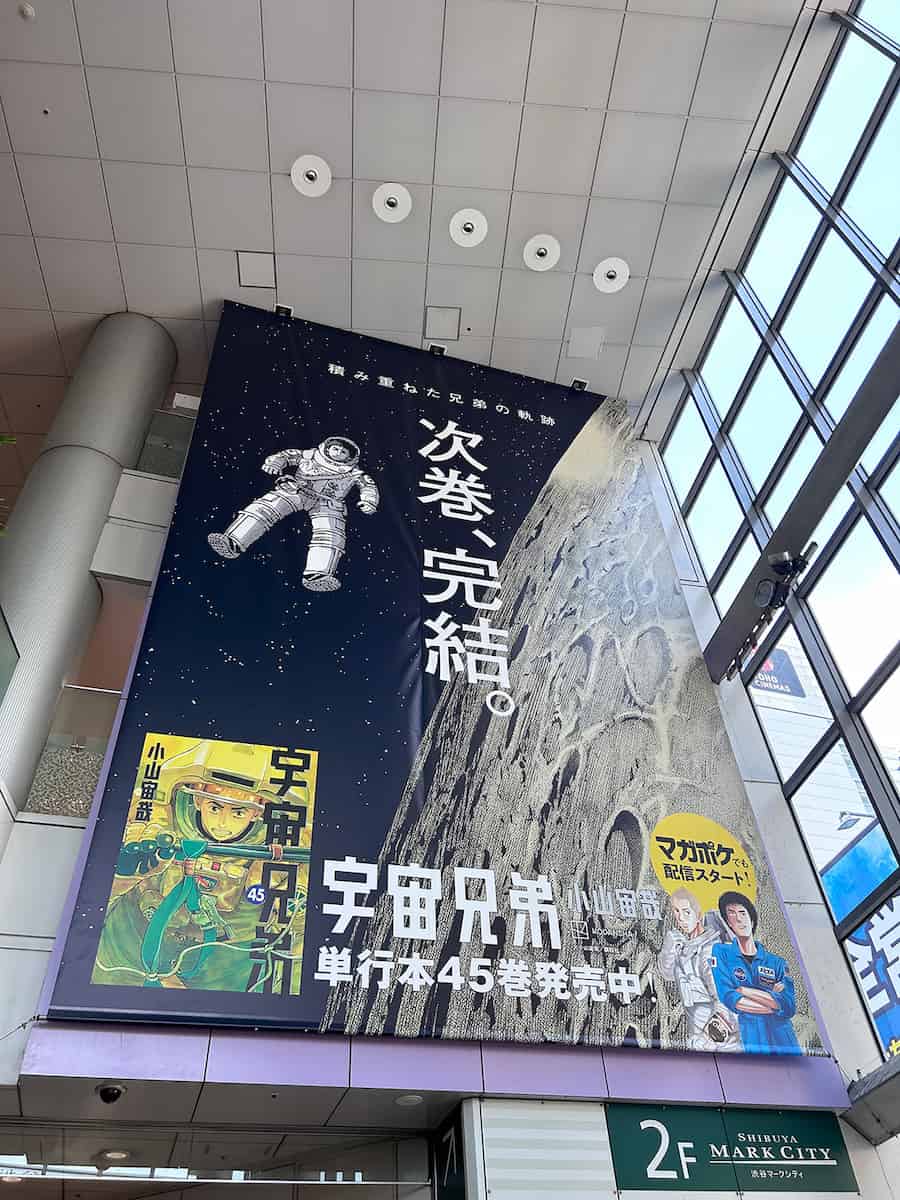 イメージ 東京・渋谷マークシティにて漫画『宇宙兄弟』(著者・小山宙哉)が次巻で完結する旨を告知する巨大タペストリー広告を掲出