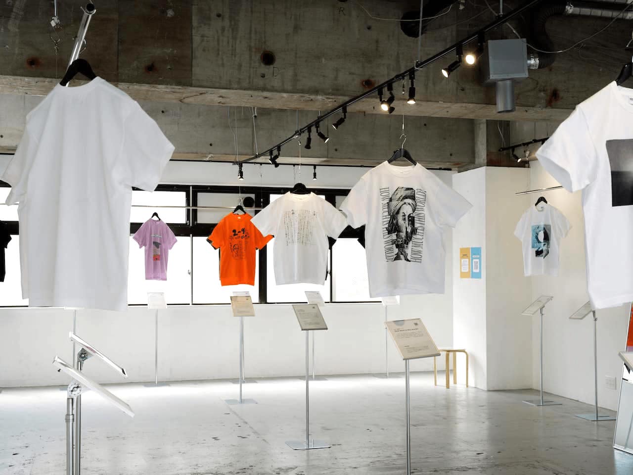 架空の「ファッションブランド」「漫画」「雑居ビル」「子ども向けおもちゃ」「学園際クラスTシャツ」などの設定をモチーフにデザインされたTシャツ。掲示された二次元コードからの購入も可能。