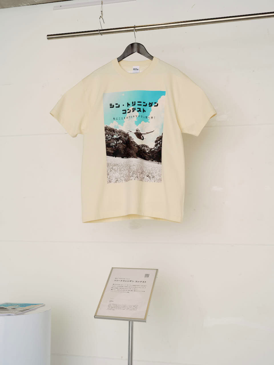 俳優・佐野岳さん制作「架空の“イベント”Tシャツ シン・トリニンゲン コンテスト」。「架空のイベント」を告知するチラシも置かれ、二次元コードから佐野さんが制作した「架空の大会動画」に遷移できる。