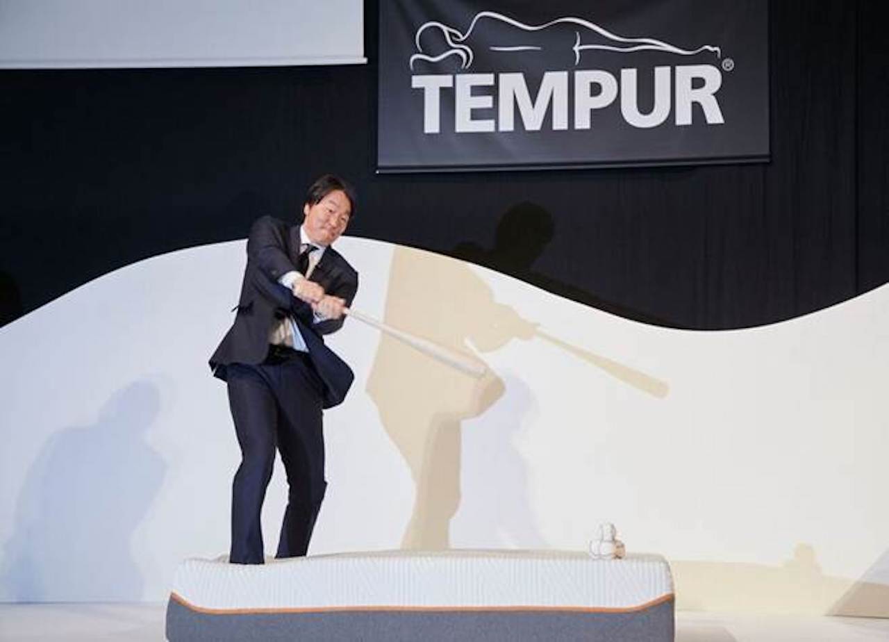 2018年2月、東京都内で開催された「テンピュール ブランドアンバサダー就任式」で、松井氏がマットレスの衝撃吸収力を体験。野球ボールを積み上げたピラミッドをマットレス上に置き、その横でフルスイングしてもボールは崩れず、「全然動かないですね」と驚きを見せた
