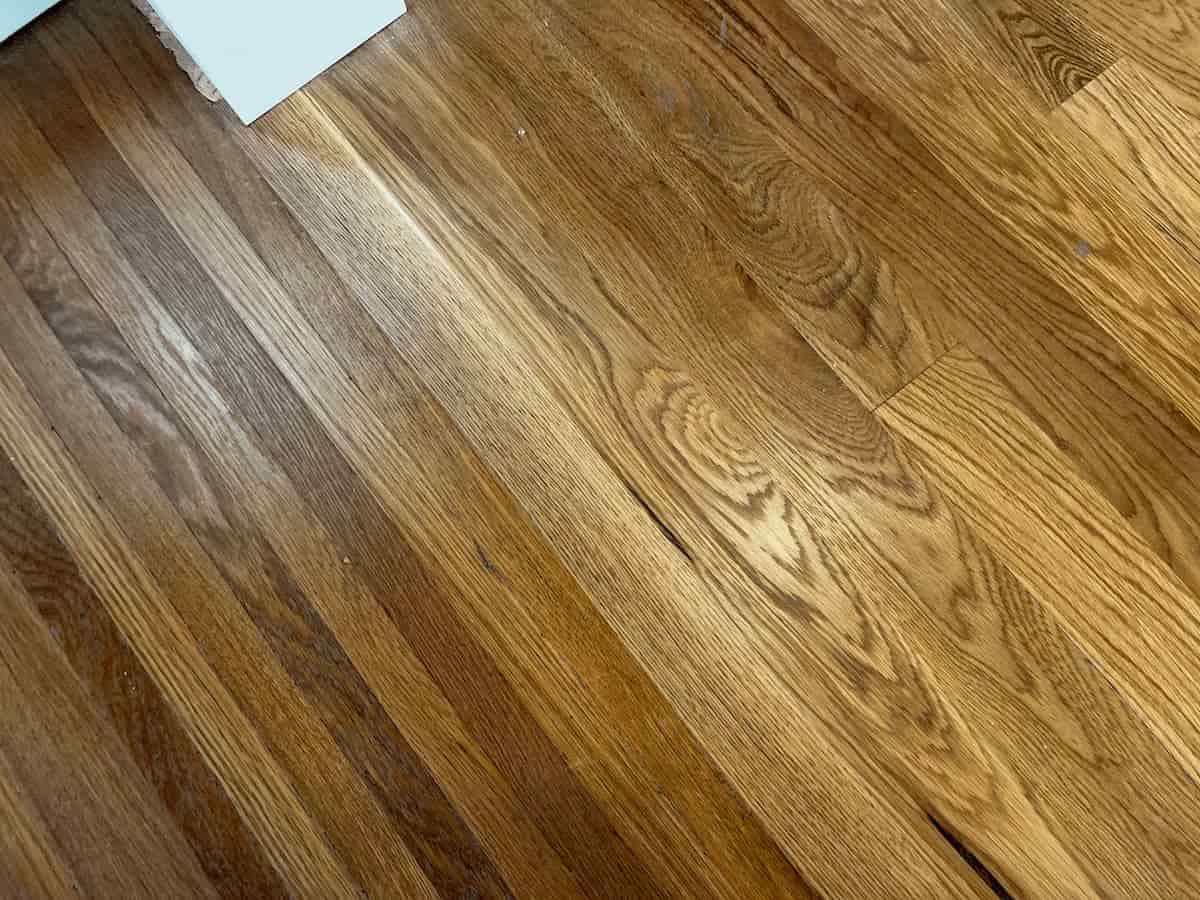 カーペットの下から出てきた古い床材。現代のものより幅が細めです。やすりで綺麗に削って使っています。