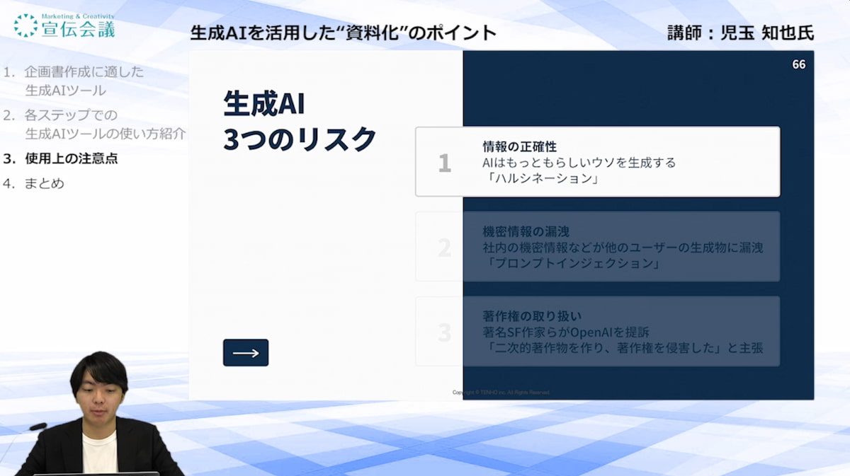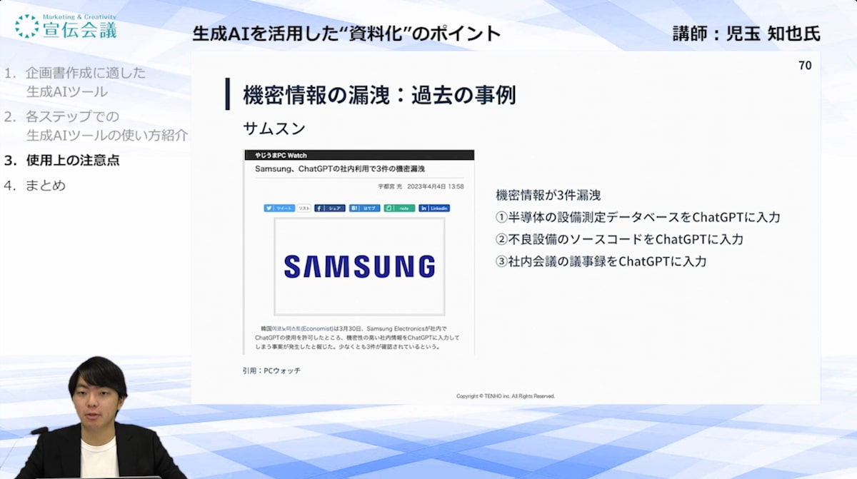 本記事では、生成AIを業務で安全に活用するために最低限知っておくべき「3つのリスクその対策」について、株式会社TENHOの児玉知也氏が解説します。