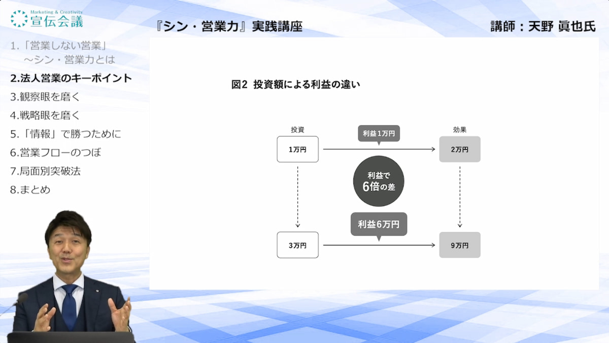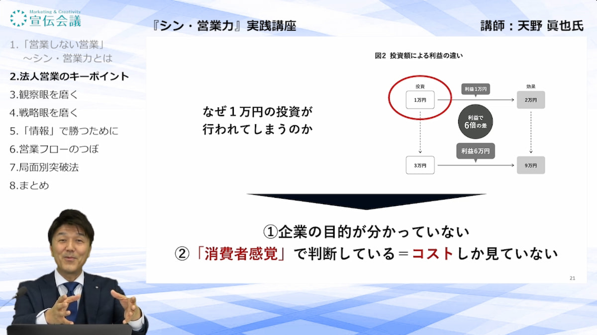株式会社カクシンの天野眞也氏が提唱する「シン・営業力」の考え方に基づき、法人営業のすべての土台となる投資対効果の原理原則について解説します。