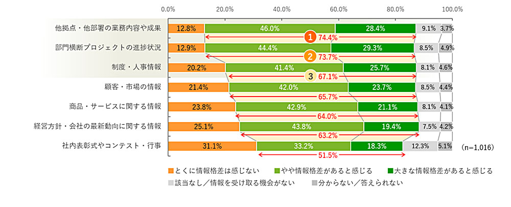 また、情報格差の有無に関する質問で「はい/感じる」「状況による/一部に感じる」と回答した79.7%に「情報格差がある」と感じる内容を質問すると、「他拠点・他部署の業務内容や成果」(74.4%)、「部門横断プロジェクトの進捗状況」(73.7%)、「制度・人事情報」(67.1%)の順で格差を感じているという結果になった。