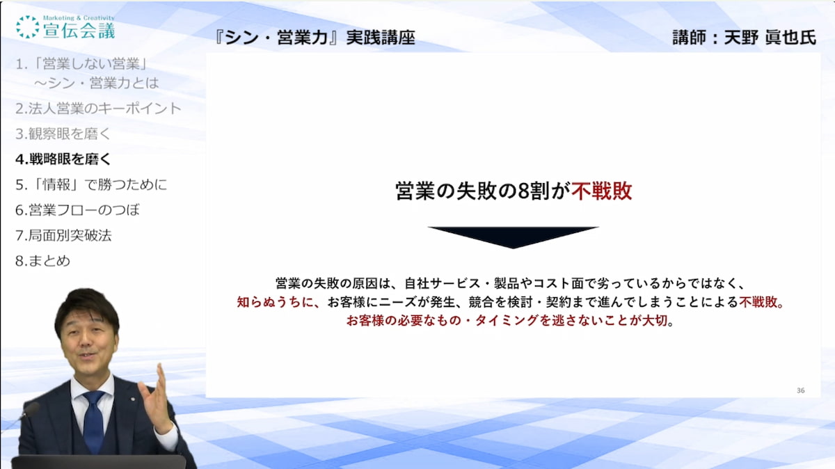 「シン・営業力」を提唱する株式会社カクシンの天野眞也氏は、リベンジすら不可能な「不戦敗」こそが、営業の失敗の約8割を占めていると指摘します。