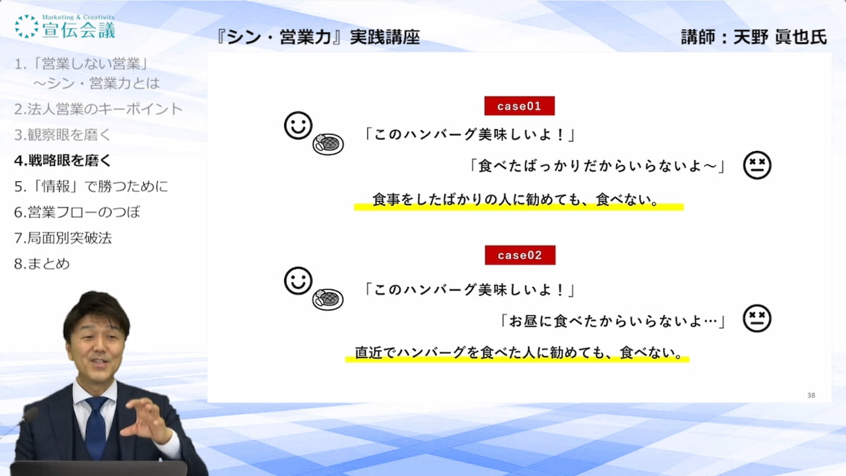 ●ケース1:食事を終えたばかりでお腹がいっぱいの人に、いくら美味しいハンバーグを勧めても食べてもらえない。