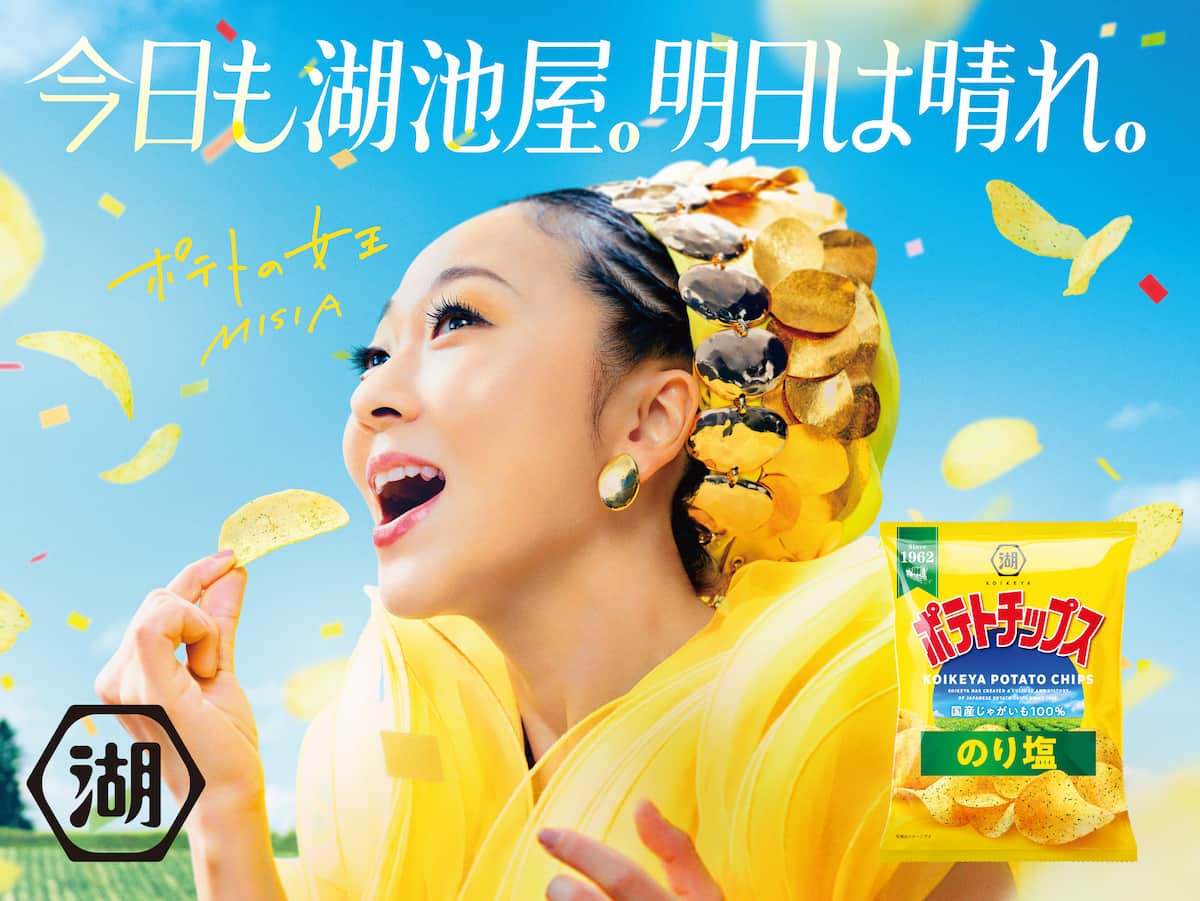 今回の新テレビCM では、歌手のMISIA さんがメインキャラクターとして初出演し、“ポテトの女王”として登場する。キーメッセージは「今日も湖池屋。明日は晴れ。」。広大なじゃがいも畑の中、MISIAさんの楽曲「明日晴れるといいな」に乗せて、「ポテトチップスがつなぐ毎日のちょっとした幸せが人々に広がる様子」を描いていく。