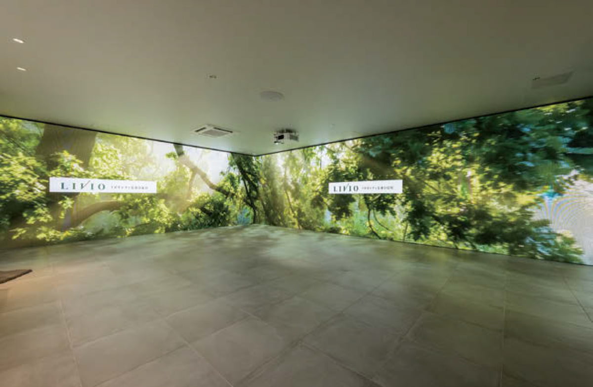 環境計画研究所の社内。手前側の壁(2面)と床に650cm×500cmのLEDパネルが敷き詰められており、そこに映像が投映されている(写真の映像は環境計画研究所で制作)