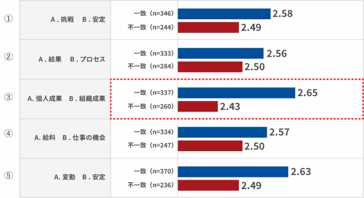 30~50代では、20代と比べると、年収の満足度を左右する条件が複雑だ。いずれの観点でも、希望と実態の一致と不一致がある場合、ほぼ同程度に年収の満足度に違いが出た。また、評価の観点や評価の反映内容、賃金制度に関して、社員側の希望と会社実態の一致数が多い方が、年収の満足度も高い傾向にある。