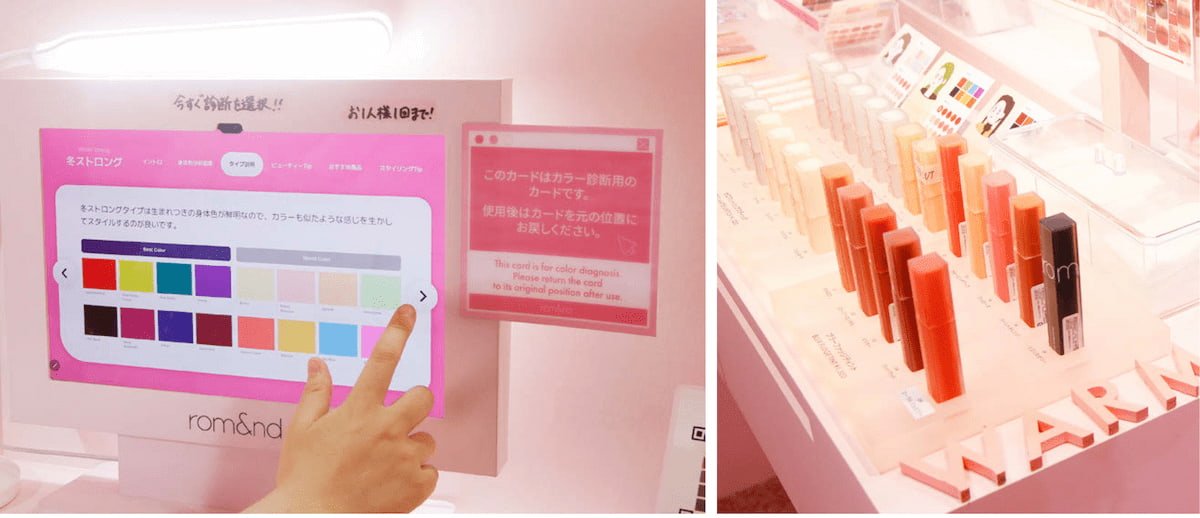 専用機械で顔を読み取り、約10秒で12タイプのパーソナルカラーを診断。結果に基づいたおすすめ製品が提示される。診断カードも数量限定で持ち帰ることができ、来場者に好評を博した。ショップ中央のリップゾーンは、イエベ・ブルべ別に商品を陳列。