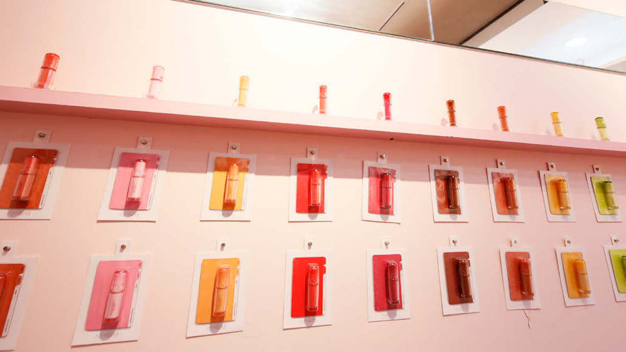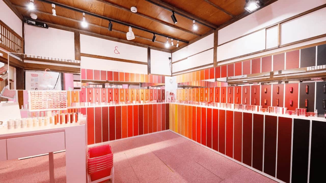 店内でまず目に入るのは、リップが壁一面に並ぶウォールゾーン。ブランドの多彩なカラースペクトラムを視覚的に表現した。韓国のムードに“和のエッセンス”を加えた内装も特徴。