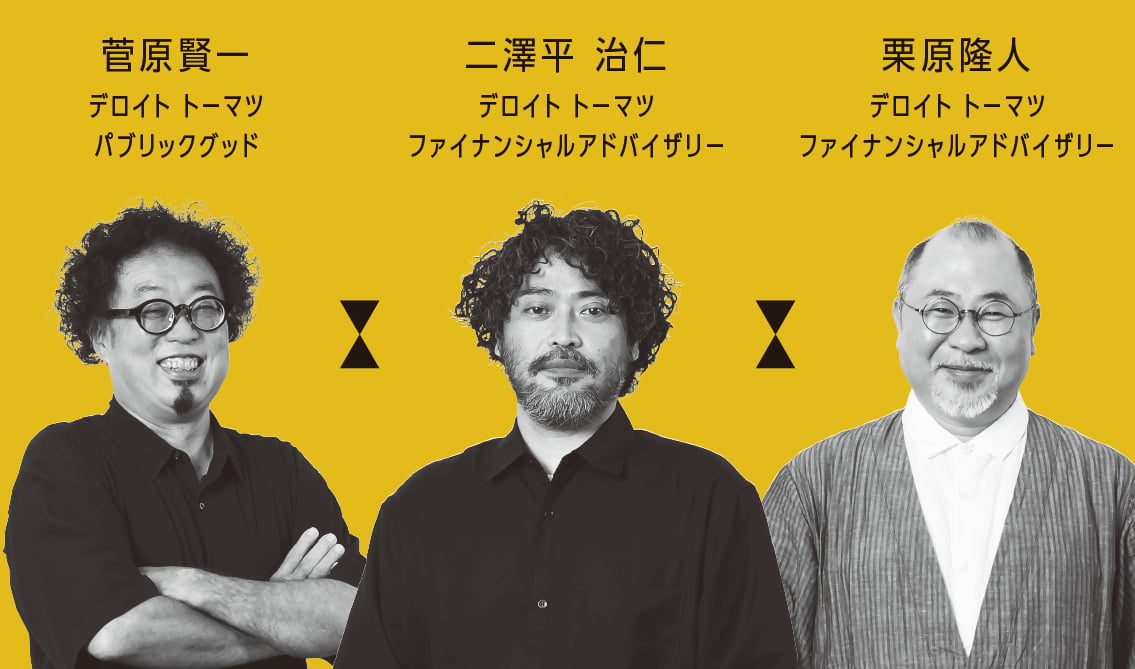 デロイト トーマツ パブリックグッド 代表取締役 菅原賢一さん、デロイト トーマツ ファイナンシャルアドバイザリー Design & Brand ディレクター 二澤平治仁さん、同社Design & Brand パートナー 栗原隆人さん。