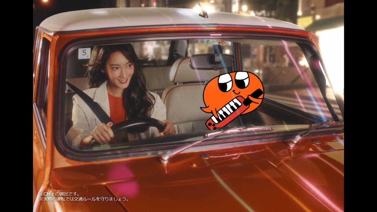 「ナナオ&ナナエ」篇CMカットの一部。理想の車を見つけた次のカットから突如秋山さんにキャストが変わるドッキリ演出。