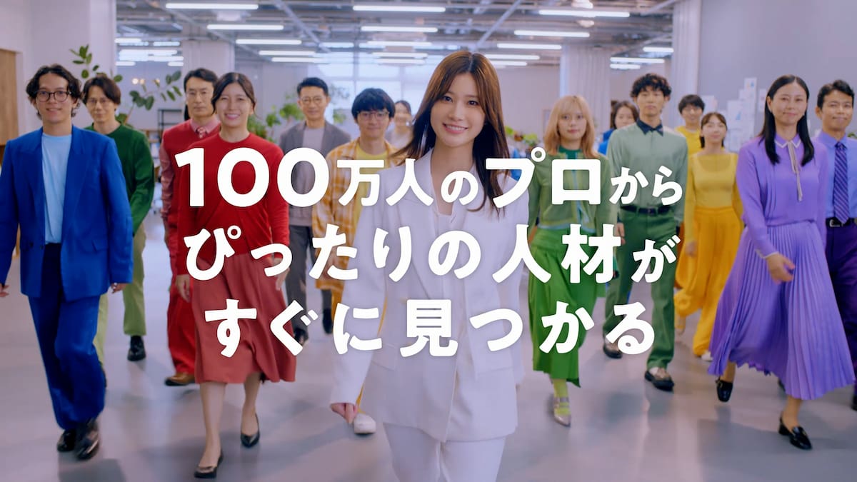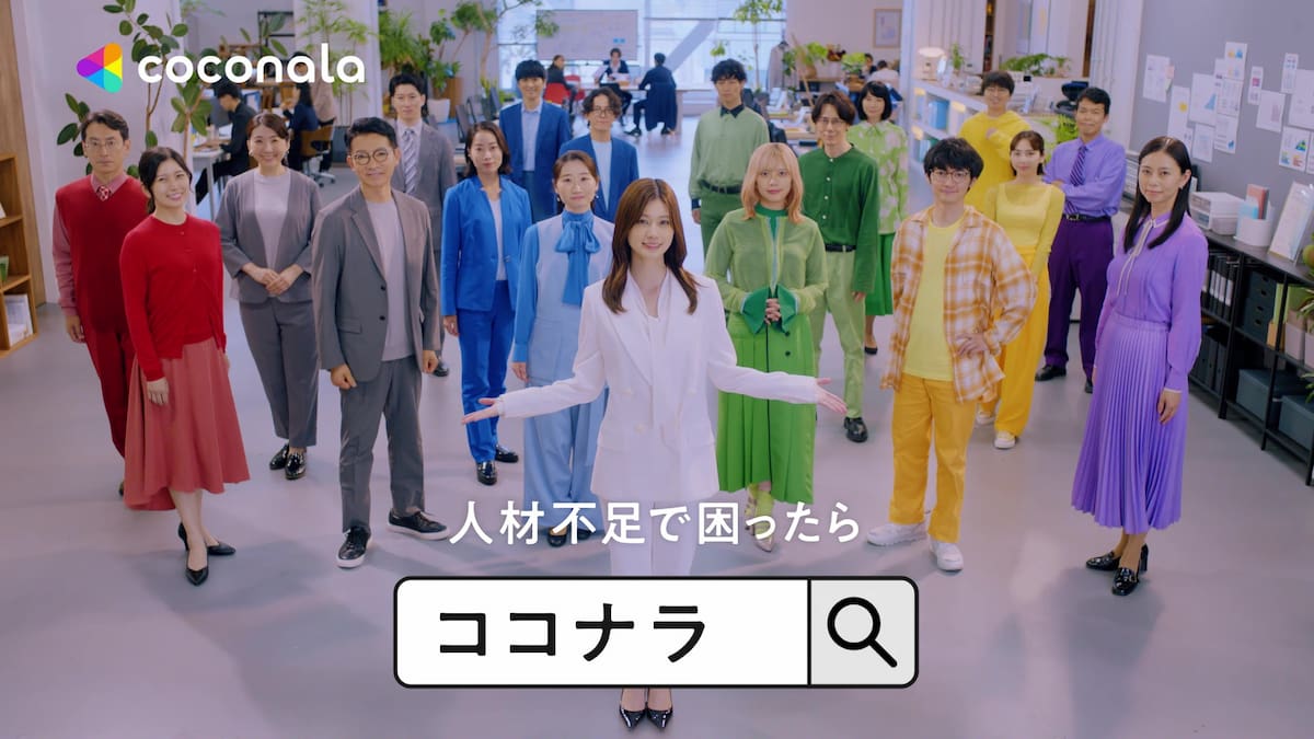 CMでは白のパンツスーツ姿の生見がオフィスに現れ、「デザイナーもココナラ!」「エンジニアもココナラ!」と歩きながら声をかける。するとカラフルな衣装の人々が次々と登場し、フリーランス人材が揃う場面へと展開。最後は「100万人のプロからぴったりの人材がすぐに見つかる!」のメッセージとともに、生見が「人材不足で困ったらココナラ!」と呼びかける。