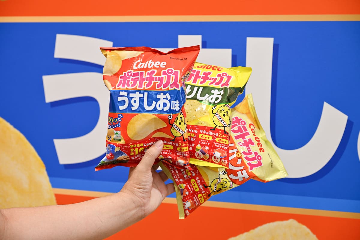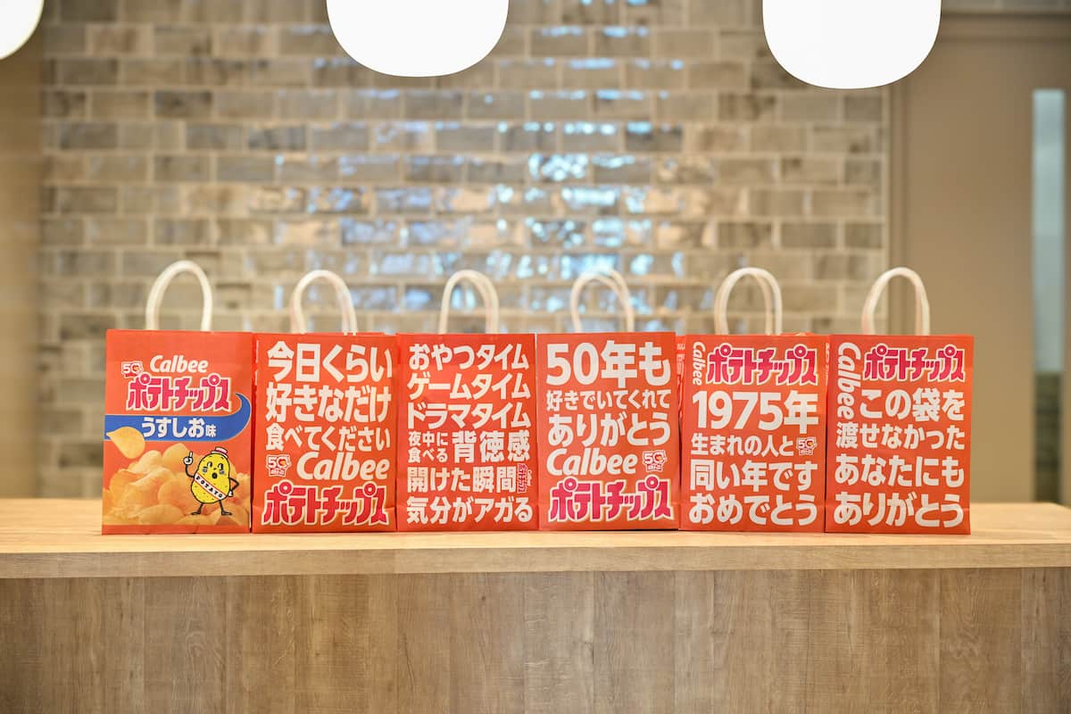 カルビーは9月1日、「ポテトチップス」発売50周年を記念し、東京駅のイベントスペースでサンプリングを実施した。うすしお、のりしお、コンソメパンチのレギュラーサイズ3袋を、感謝メッセージ入りの紙袋に詰めて配布し、会場には50種類の商品が並ぶ巨大フォトブースも登場した。