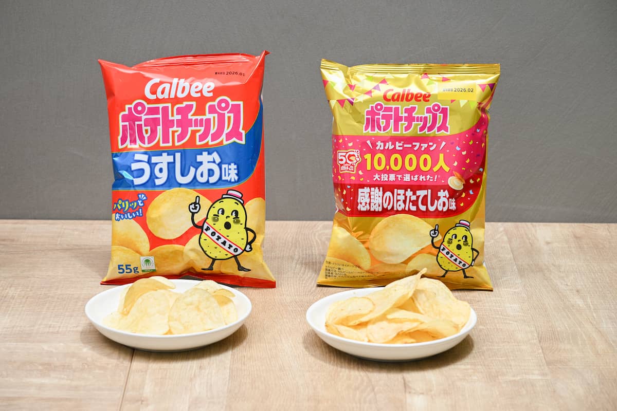 ポテトチップス「うすしお味」(左)と、数量限定で販売される「ホタテしお味」(右)