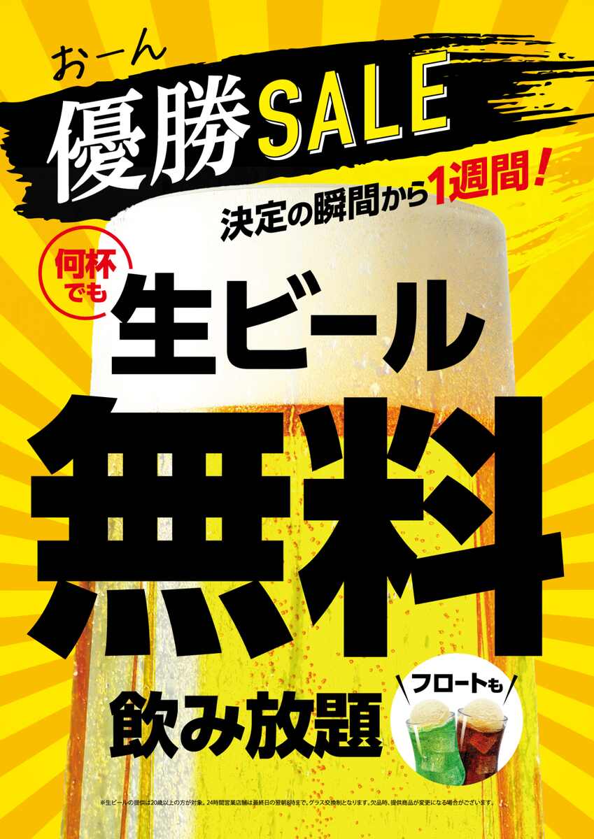 京都に本社を置くTOAIが展開するカラオケチェーン店「ジャンボカラオケ広場」では、優勝決定の瞬間から1週間、生ビールとフロート無料のキャンペーンを開始。セール期間中は何杯でも無料になる(一部対象店舗のみ)。