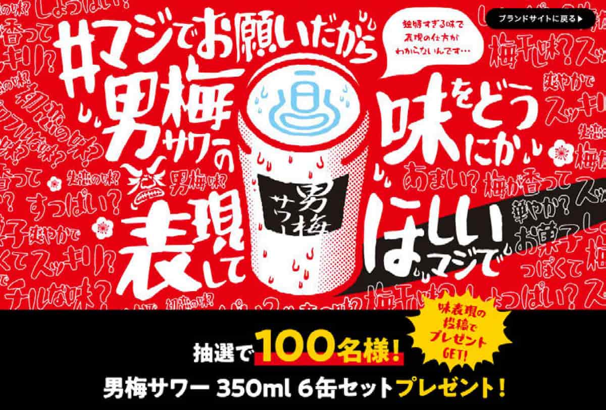サッポロビールは「サッポロ男梅サワー」ブランドにおいて、6月20日から7月18日まで、「#マジでお願いだから男梅サワーの味をどうにか表現してほしいマジでキャンペーン」を実施。男梅サワーの独特な味を表現するアイデアをX上で募集し、応募者の中から抽選で商品プレゼントをした。