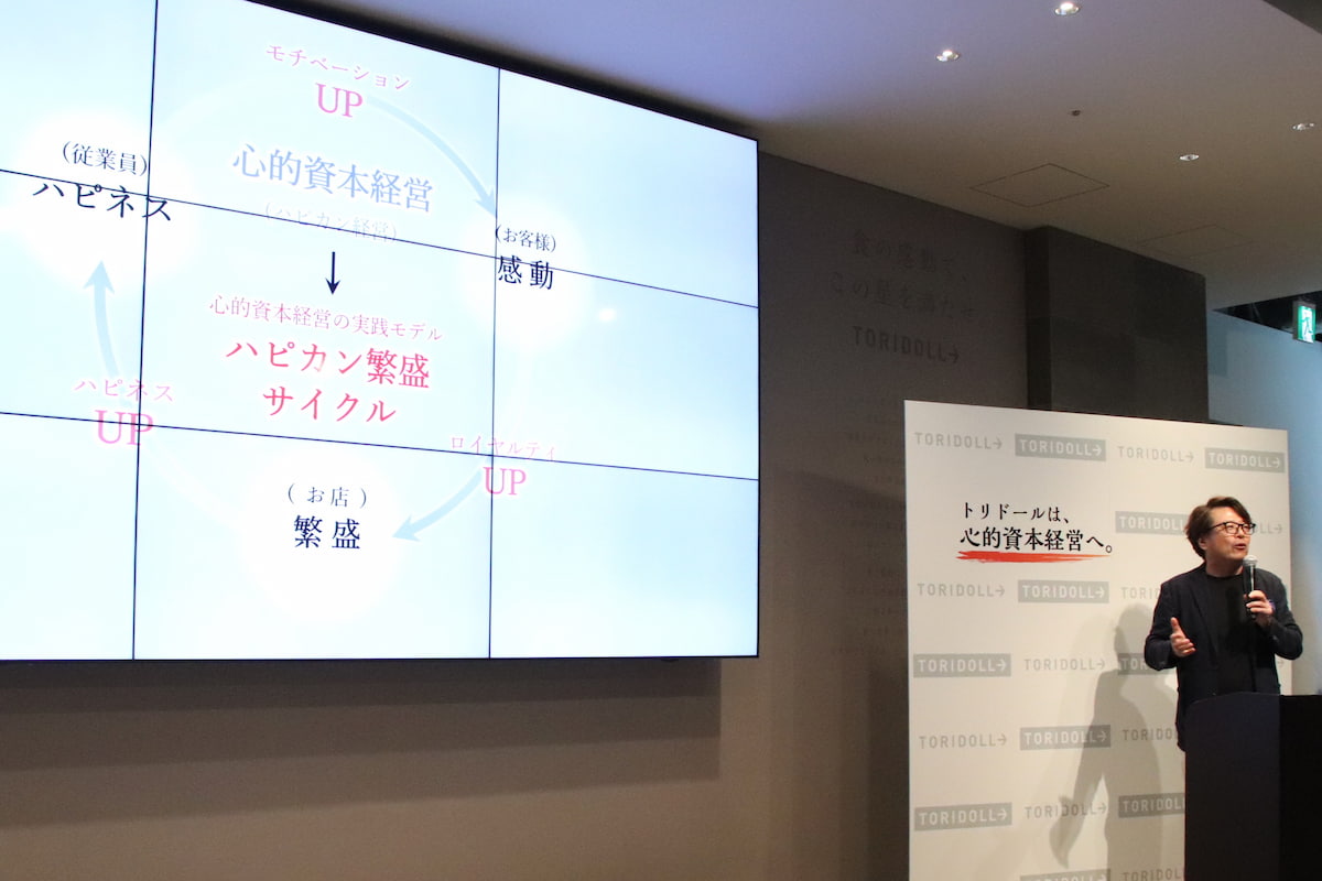 9月17日にトリドールHD本社(東京・渋谷)で開催したメディア向けの説明会で心的資本経営について解説する粟田貴也社長 兼CEO