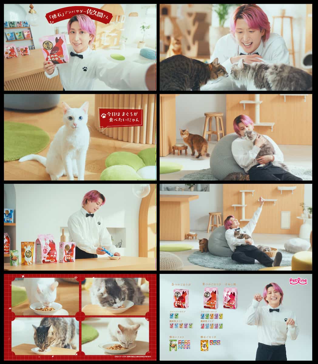 CMの舞台は、猫が集まる“懐石レストラン”。店長役を務める佐久間が、手にしたメニューを見ながら「今日は何が食べたいかな?」と語りかける。「にゃ~」と応える猫の言葉を理解したように、「は~い、薄切りマグロ入りです」「君にはレトルト」「君にはおやつだよ」と一匹ずつに声をかけながらフードを提供。最後は、猫を抱えた佐久間の自撮り風のアングルに、「猫様には、懐石。」のナレーションが重なる。