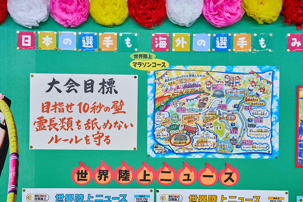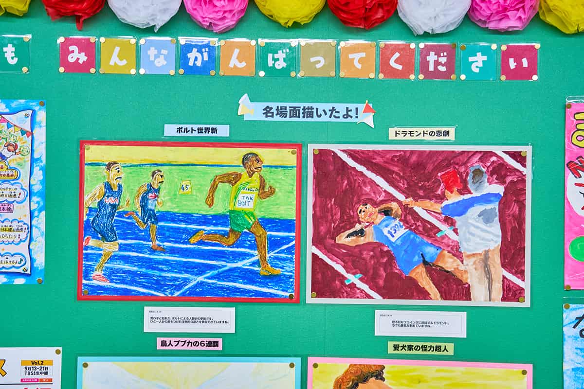「小学生、先生、PTAの方々を憑依させて、世界陸上を盛り上げる思いで製作しました」と話すのはアートディレクターの碓井達朗氏。詳細な設計図を事前に用意していたものの、画鋲で書かれた「キターーー」は急きょ最後に加えられた仕掛けだという。