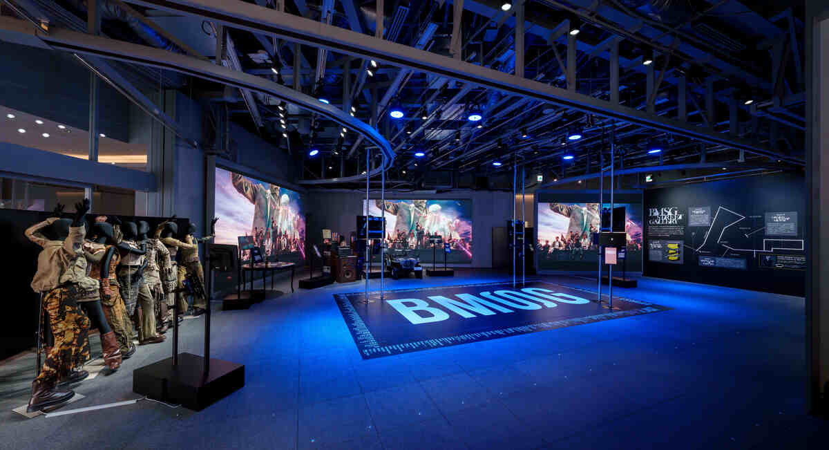 SHIBUYA TSUTAYAに構えたゾーンの1階では、所属アーティストのミュージックビデオなどを三面スクリーンで上映しているほか、ミュージックビデオで使用された衣装なども展示。足元の「BMSG」のロゴの周りを囲むように、これまでリリースしてきた曲名がずらりと並ぶなど、細やかな仕掛けが多数施されている