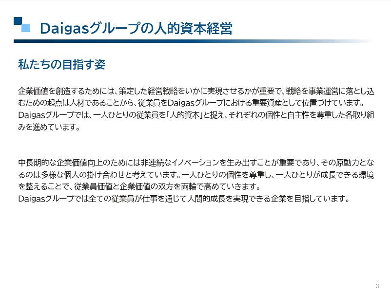 2024年版では、中期経営計画で設定したKPIや各指標、経営戦略と連動した人材戦略のストーリーや、各人事施策の詳細と具体的な取り組み内容を掲載した。冒頭には「Daigasグループの人的資本経営」として、目指す姿を記述。「一人ひとりの個性を尊重し、一人ひとりが成長できる環境を整えることで、従業員価値と企業価値の双方を両輪で高めていきます」としていた。