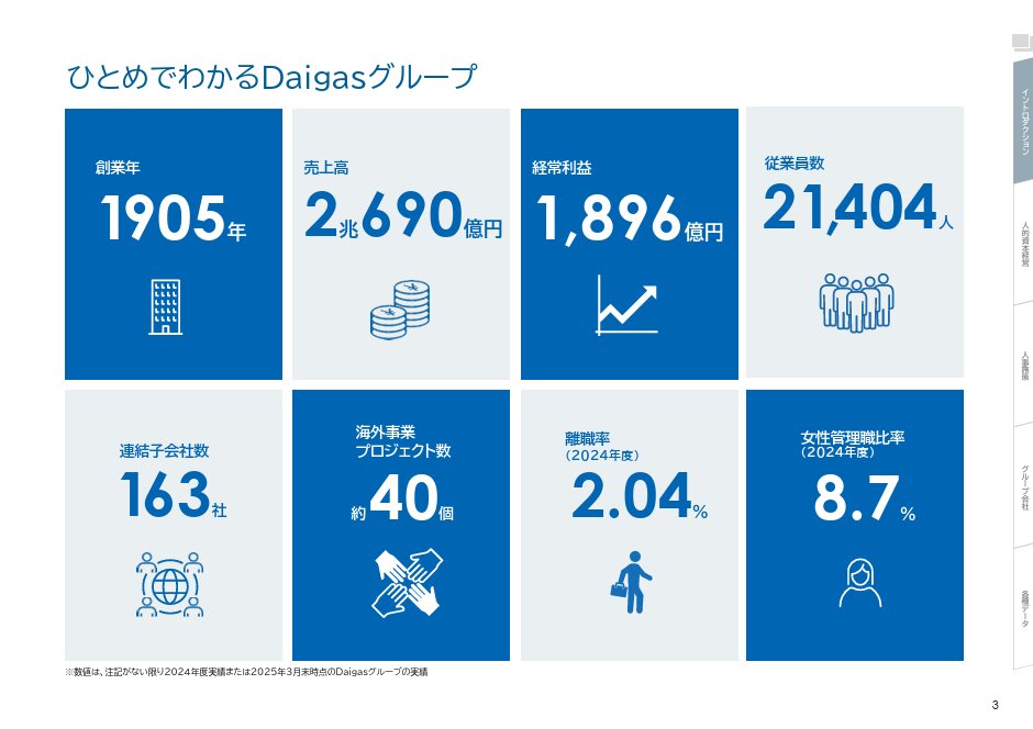2025年版では、冒頭に「ひとめでわかるDaigasグループ」を掲載。数値とビジュアルを融合して同社グループの特徴を大枠で示している。